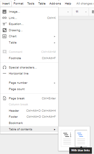 Once you’ve finished changing your settings, you can tell Docs to create a table of contents. You can use Insert > Table of Contents to select a table that fits your specific needs. You can pick an option with page numbers: